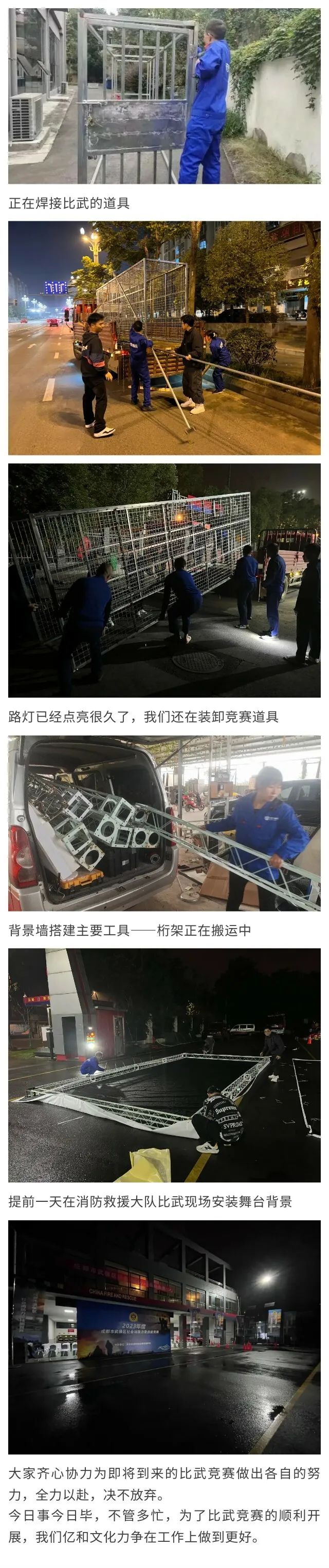 各區(qū)消防救援大隊舉行的社會消防力量技(jì )能(néng)比武競賽的正常開展,億和文(wén)化為(wèi)前期籌備工(gōng)作(zuò)全力以赴。我們安(ān)裝(zhuāng)人員通宵達旦制作(zuò)消防技(jì )能(néng)競賽破拆道具(jù)、搭建桁架、比武道具(jù)等不可(kě)或缺的基礎器材器械,為(wèi)各區(qū)消防救援大隊比武競賽做了強有(yǒu)力的幕後支撐。
