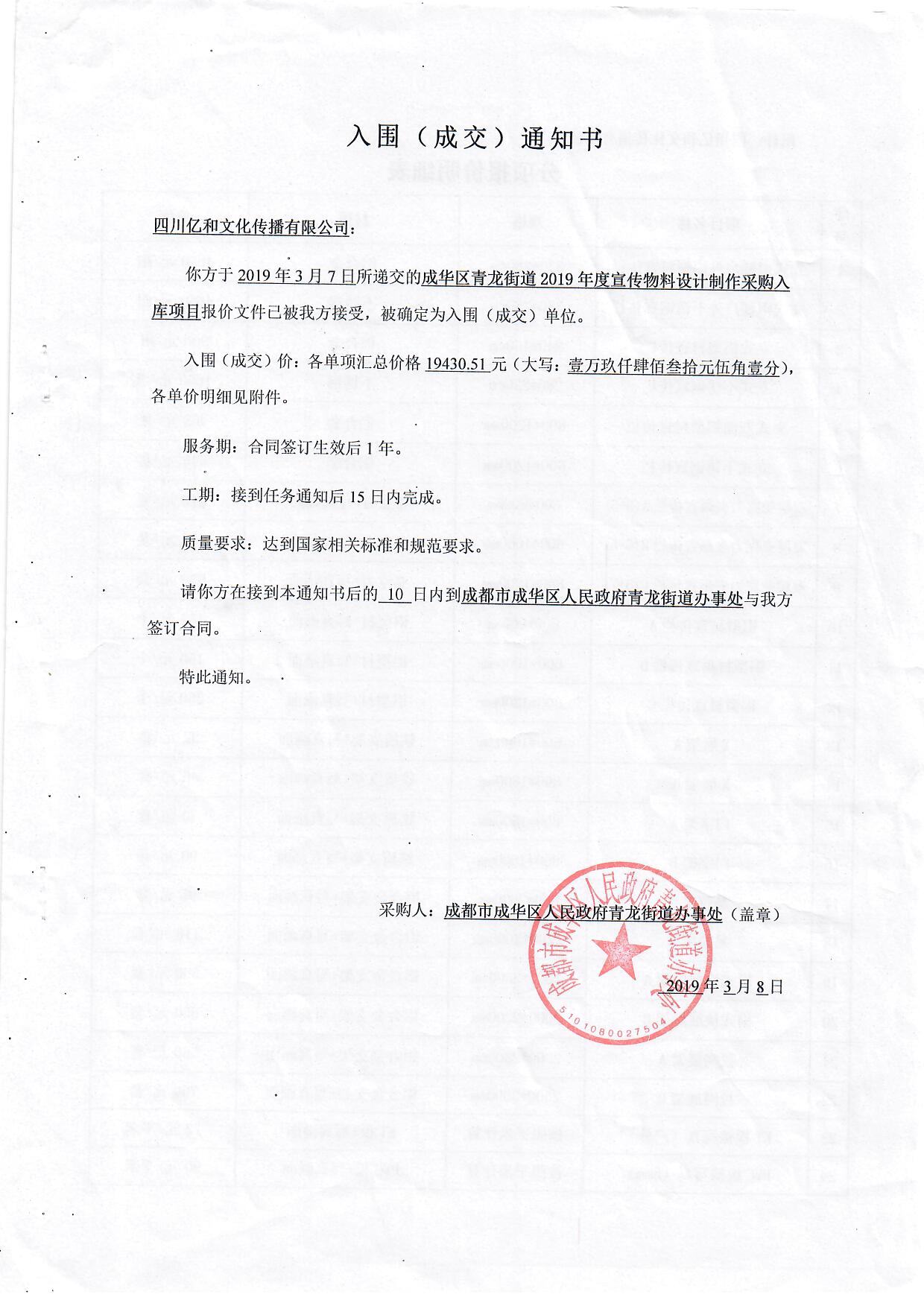 【喜訊】公(gōng)司中(zhōng)标2019年“成華區(qū)青龍街(jiē)道2019年度宣傳物(wù)料設計制作(zuò)采購(gòu)入庫項目”!