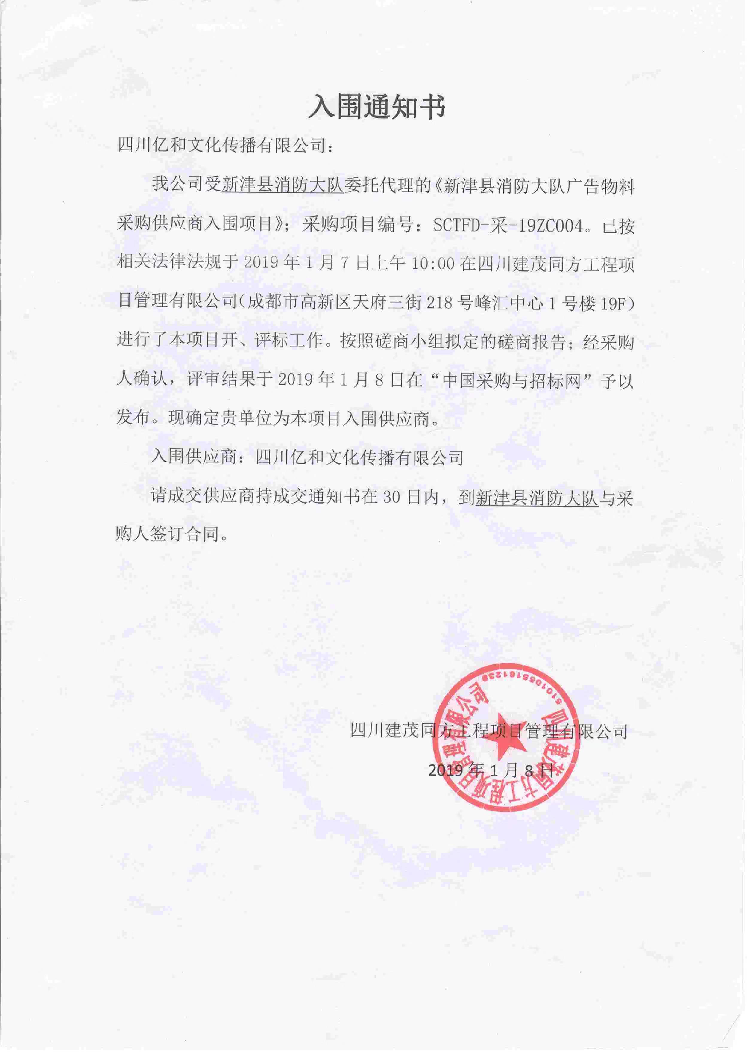 【喜訊】公(gōng)司中(zhōng)标2019年“成都市新(xīn)津縣消防大隊廣告物(wù)料采購(gòu)供應商(shāng)入圍項目”!