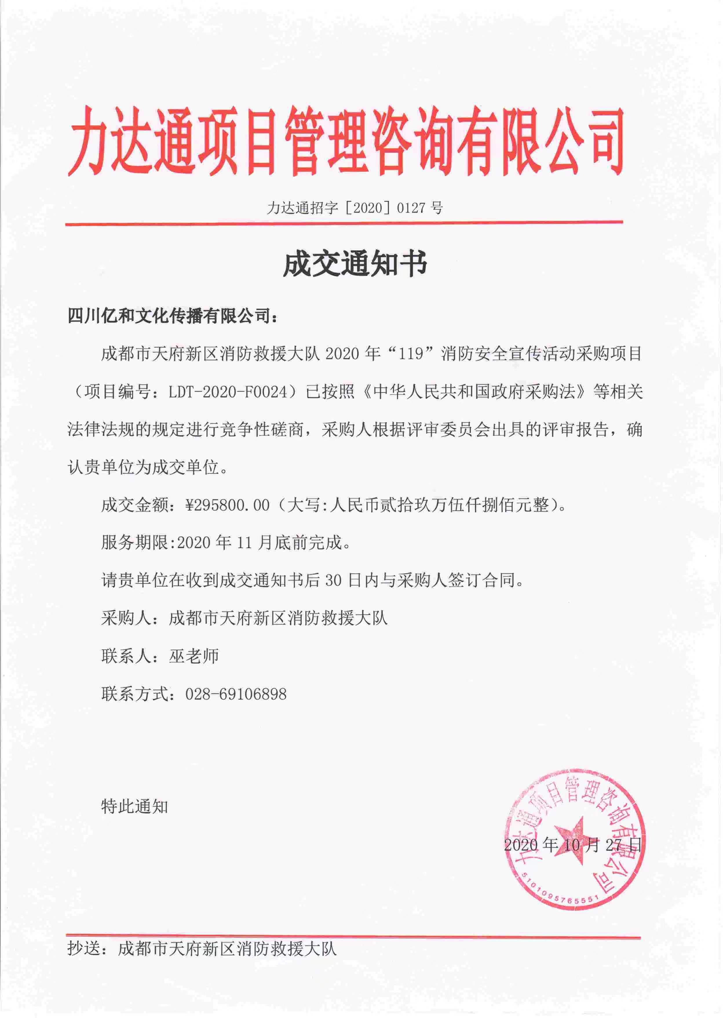 【喜訊】公(gōng)司中(zhōng)标2020年“成都市天府新(xīn)區(qū)消防救援大隊2020年‘119’消防安(ān)全宣傳活動采購(gòu)項目”!