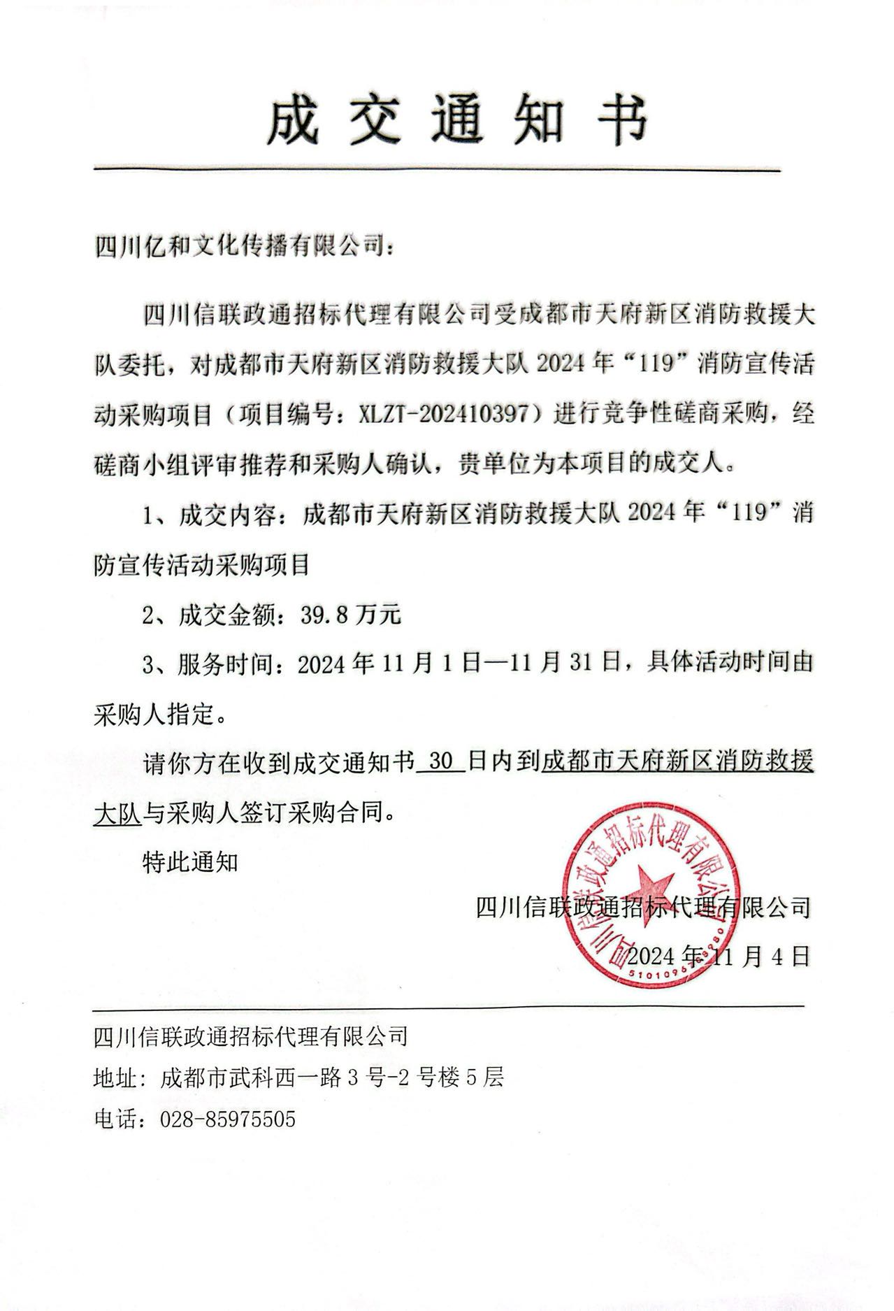 【喜訊】公(gōng)司中(zhōng)标“成都市天府新(xīn)區(qū)消防救援大隊2024年‘119’消防宣傳活動采購(gòu)項目”