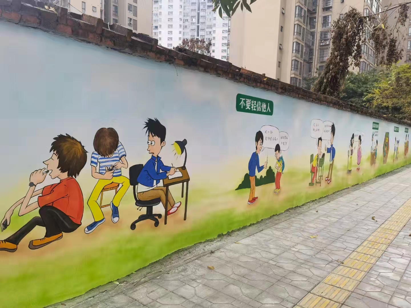 本次活動巧妙利用(yòng)卡通人物(wù)形象在提升社區(qū)“顔值”的同時,生動形象的描繪出生活中(zhōng)存在安(ān)全隐患的情形,以“慎重交友”,“不要輕信他(tā)人”等醒目字眼結合卡通人物(wù)形象促使小(xiǎo)孩到老人都能(néng)輕松理(lǐ)解,在宣傳禁毒活動的方式上起到重要作(zuò)用(yòng)。