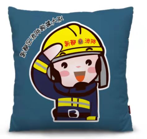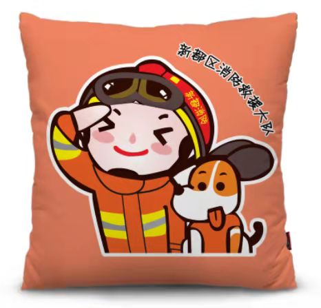 消防大隊抱枕設計展示圖,圖中(zhōng)用(yòng)卡通式的消防人員,形象可(kě)愛,符合時代特點。