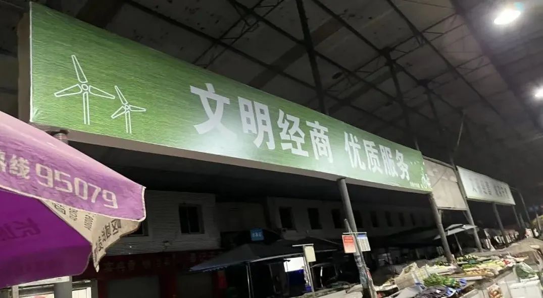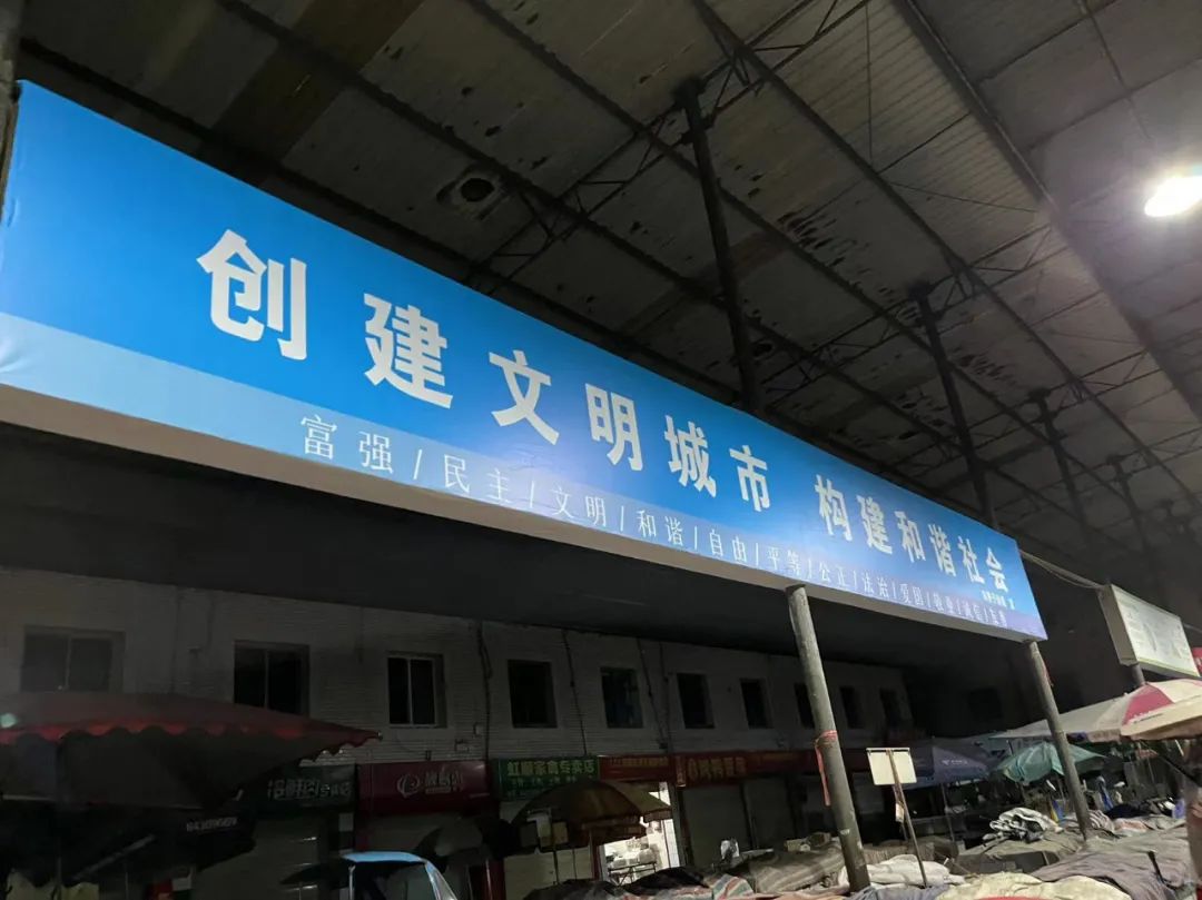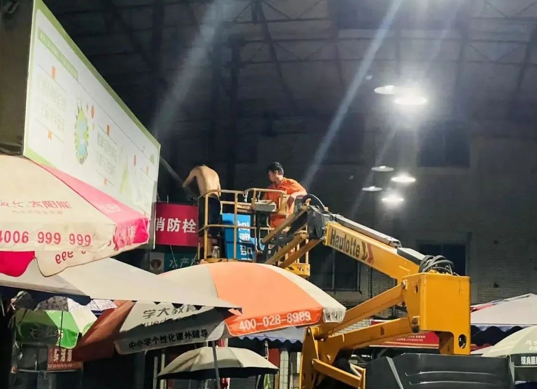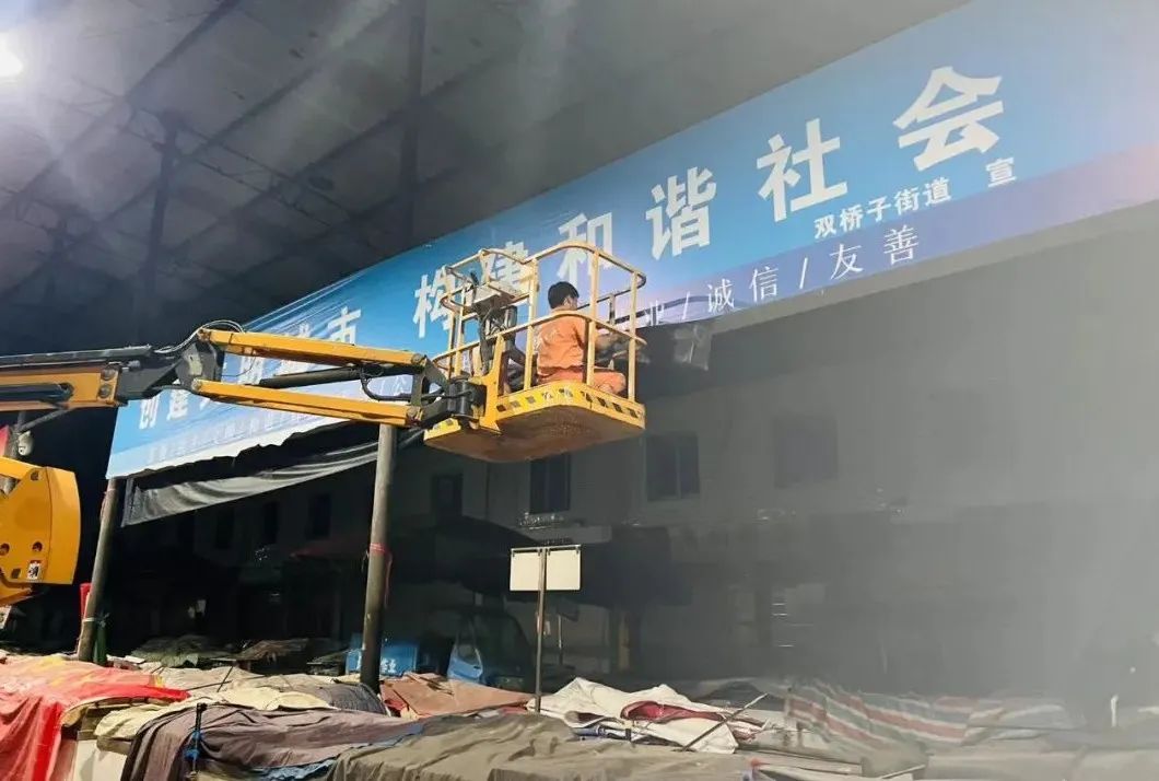 工(gōng)作(zuò)人員更換農貿市場外鐵皮字