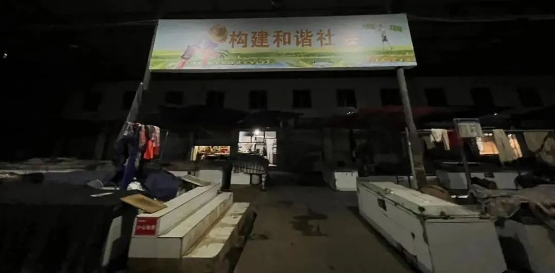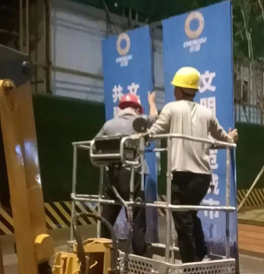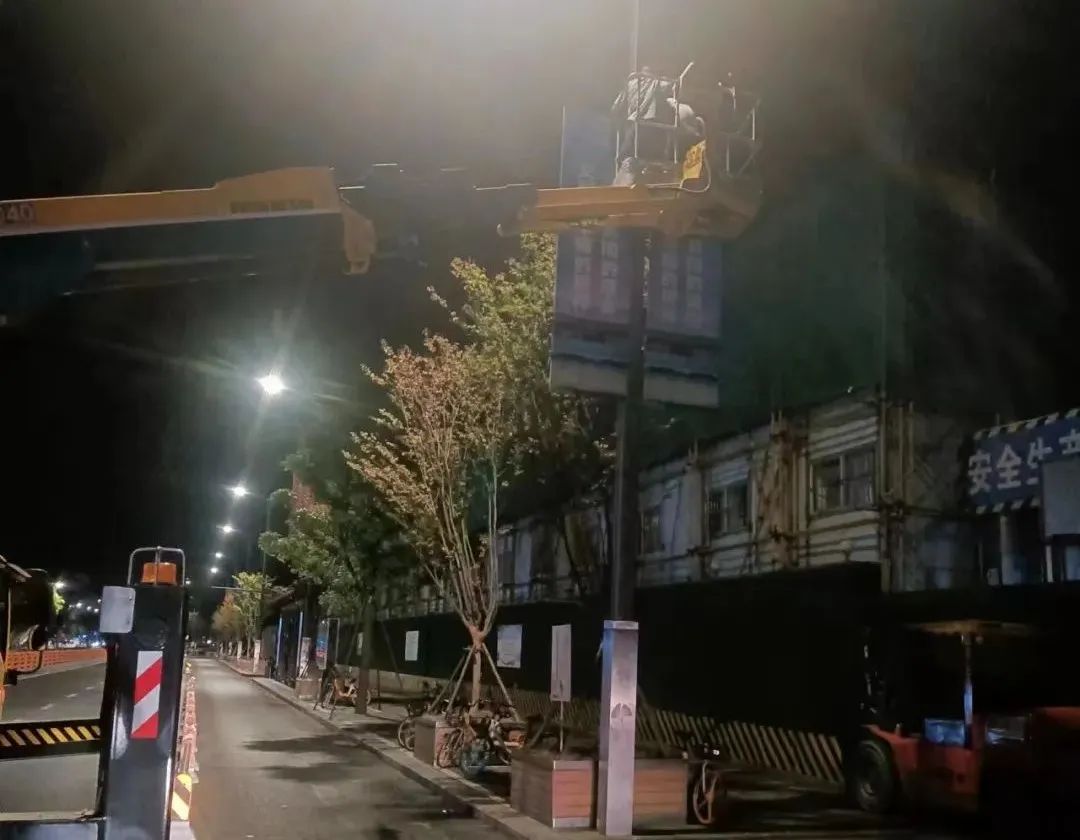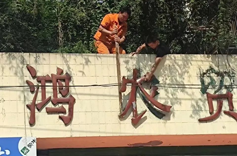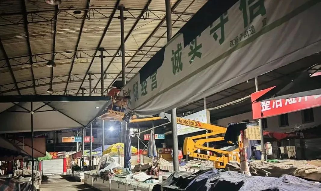 工(gōng)作(zuò)人員更換農貿市場外鐵皮字